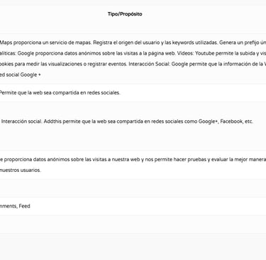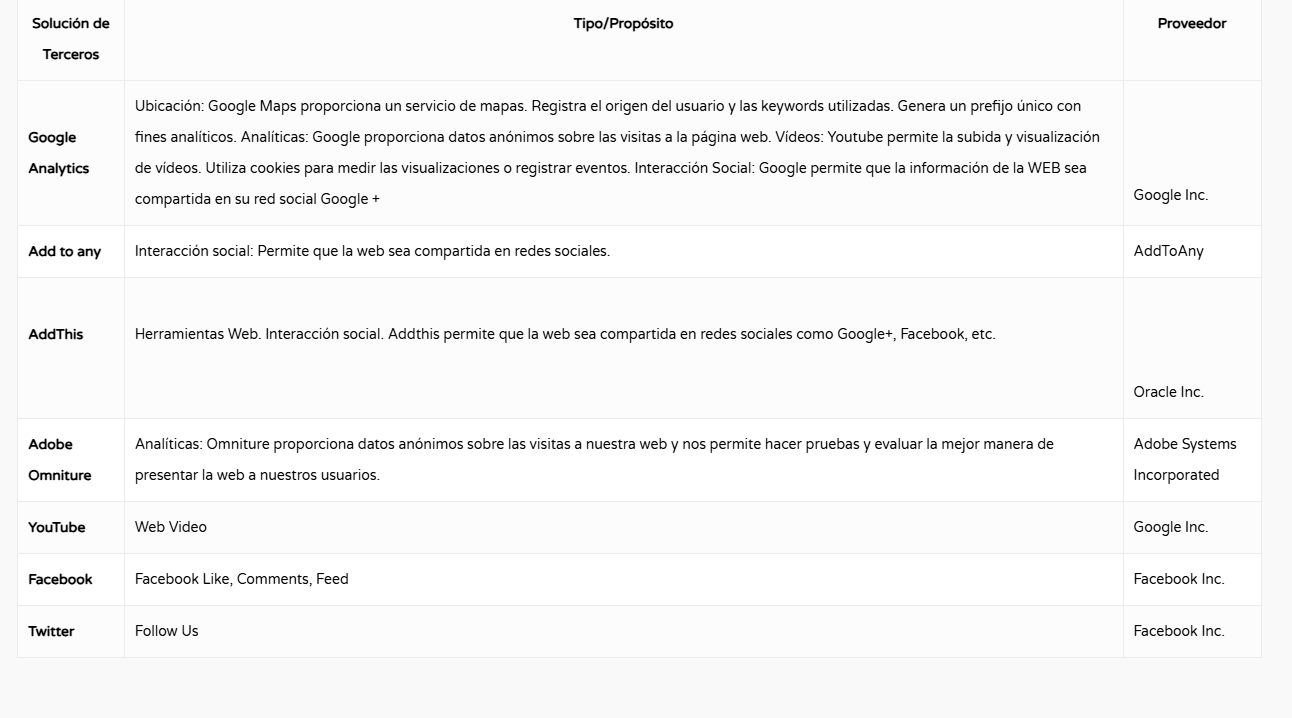¿Cuáles son las cookies de terceros utilizadas y la finalidad de uso en el sitio web?